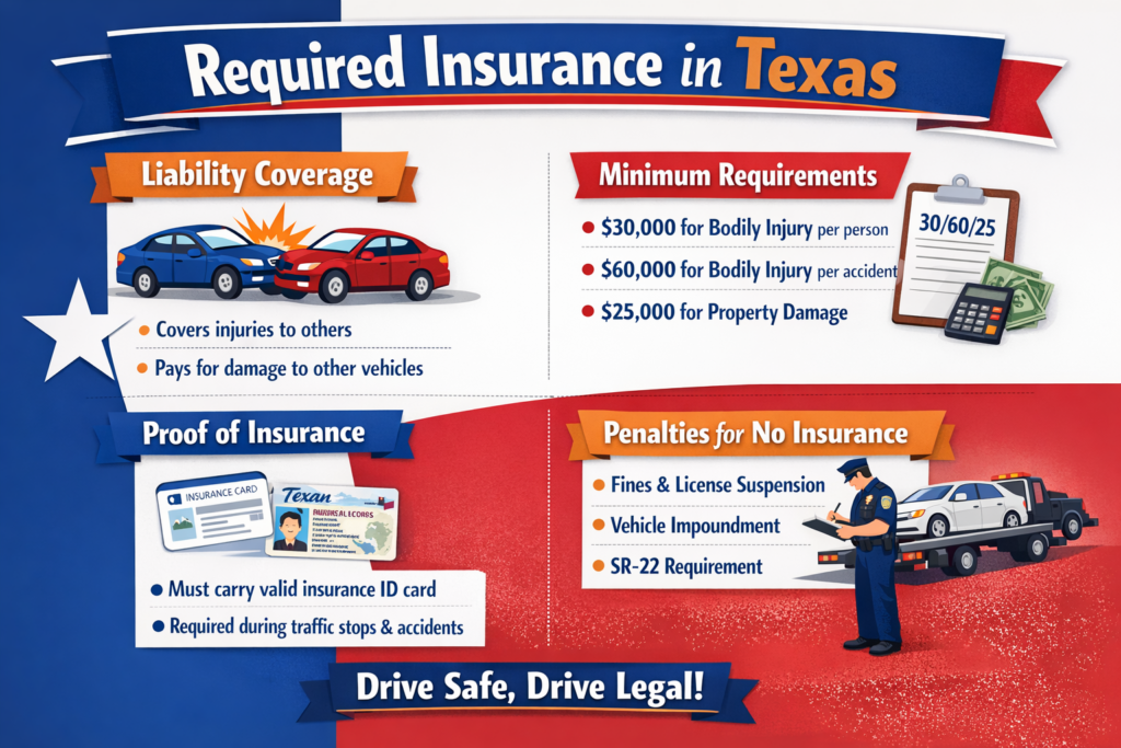 Driving in Texas without the proper insurance is not only risky—it’s illegal. The state requires all drivers to carry liability insurance as a minimum. This insurance covers the costs of injuries and damages to other people or their property if you are at fault in an accident. Specifically, Texas law sets minimum coverage amounts at $30,000 for each injured person, up to $60,000 per accident, and $25,000 for property damage per accident. This is commonly referred to as 30/60/25 coverage.